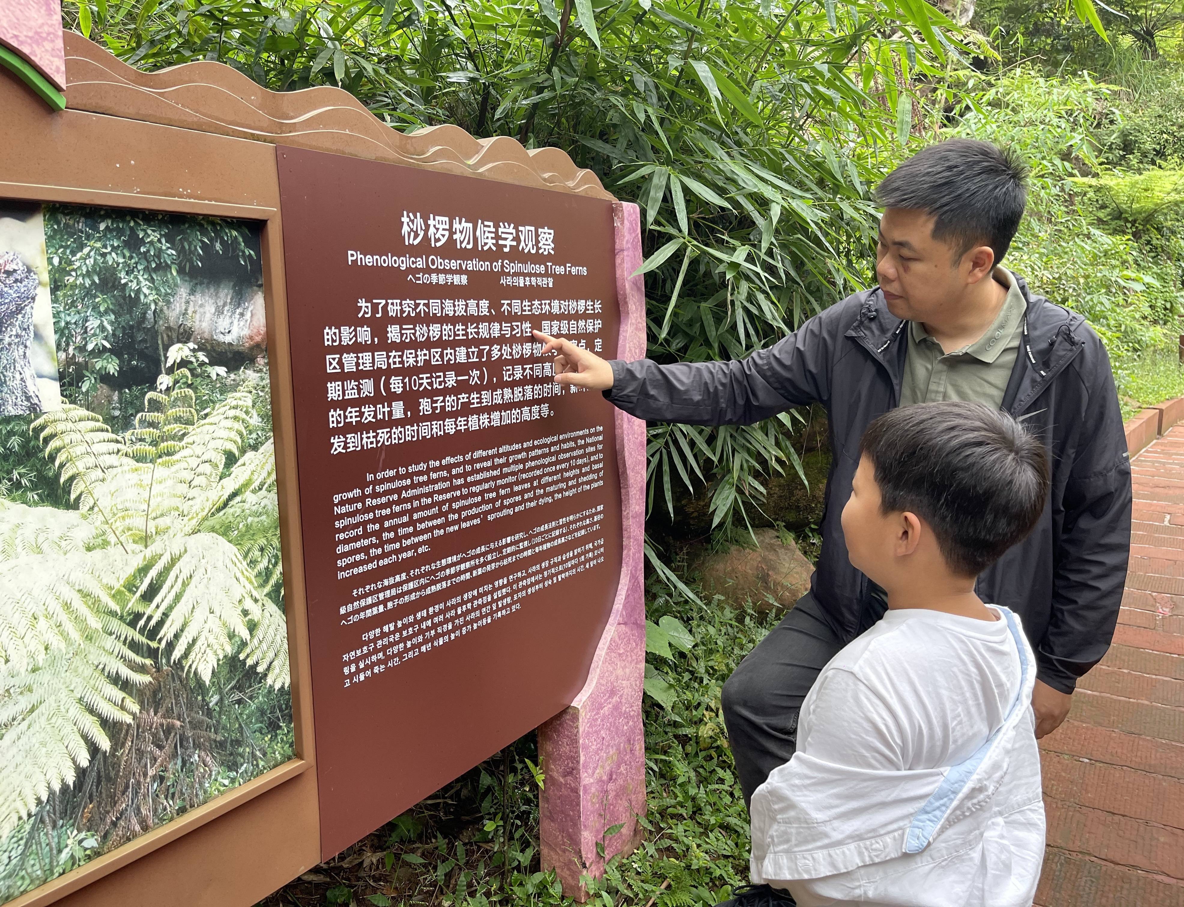 10月4日,游客在赤水丹霞旅游区·燕子岩给孩子讲解“植物活化石”桫椤。新华社记者 骆飞 摄“以前只在课本里见过‘植物活化石’,没想到能在这儿见到鲜活的,而且它们被细致地保护着,太难得。”一位游客说。